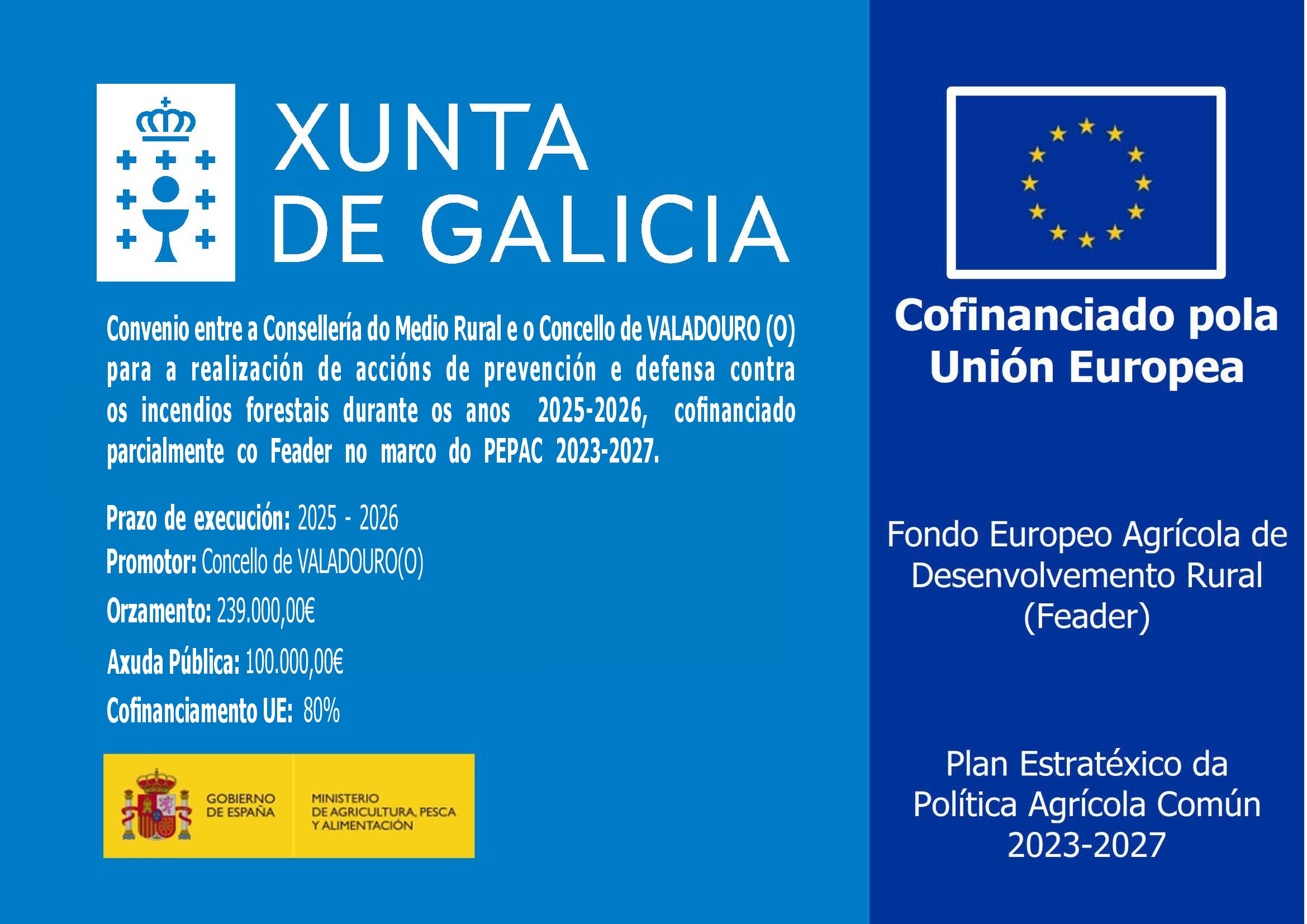 En datas pasadas, asinouse un convenio de colaboración entre a Consellería do Medio Rural e o Concello do Valadouro para a realización de accións de prevención e defensa contra os incendios forestais durante os anos 2025-2026, cofinanciado parcialmente co Feader no marco do PEPAC 2023-2027.