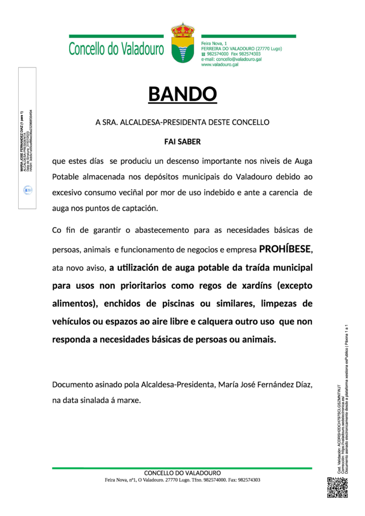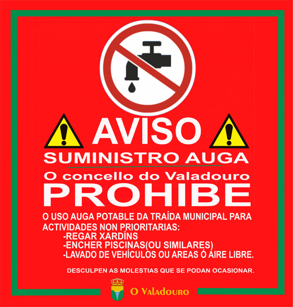 Co fin de garantir o abastecemento para as necesidades básicas de persoas, animais e funcionamento de negocios e empresa PROHÍBESE, ata novo aviso, a utilización de auga potable da traída municipal para usos non prioritarios como regos de xardíns (excepto alimentos), enchidos de piscinas ou similares, limpezas de vehículos ou espazos ao aire libre e calquera outro uso que non responda a necesidades básicas de persoas ou animais.